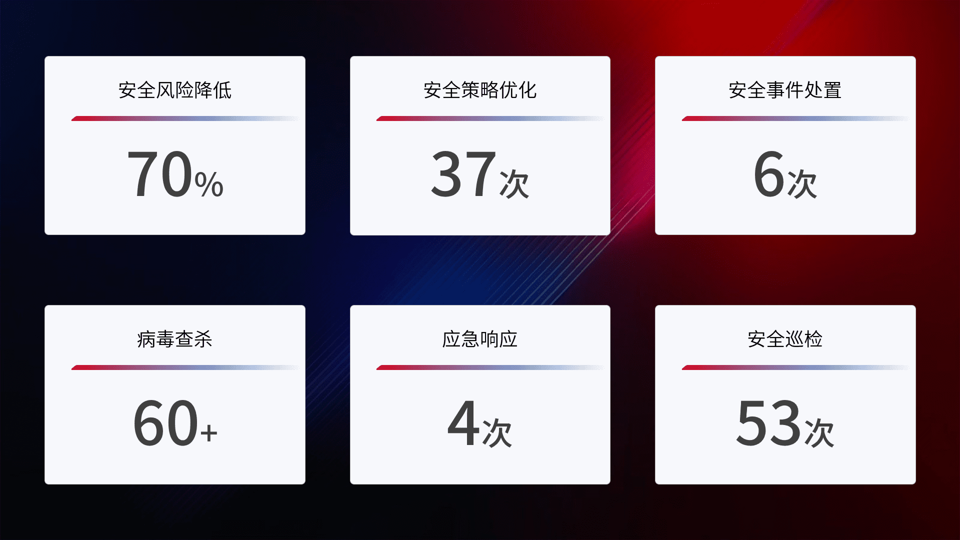 提供全面的安全事件报告体系,,,包括处置报告、、、周报、、、、季度和年度总结,,,,结合持续监控,,,,帮助客户深入了解网络安全状况。。
