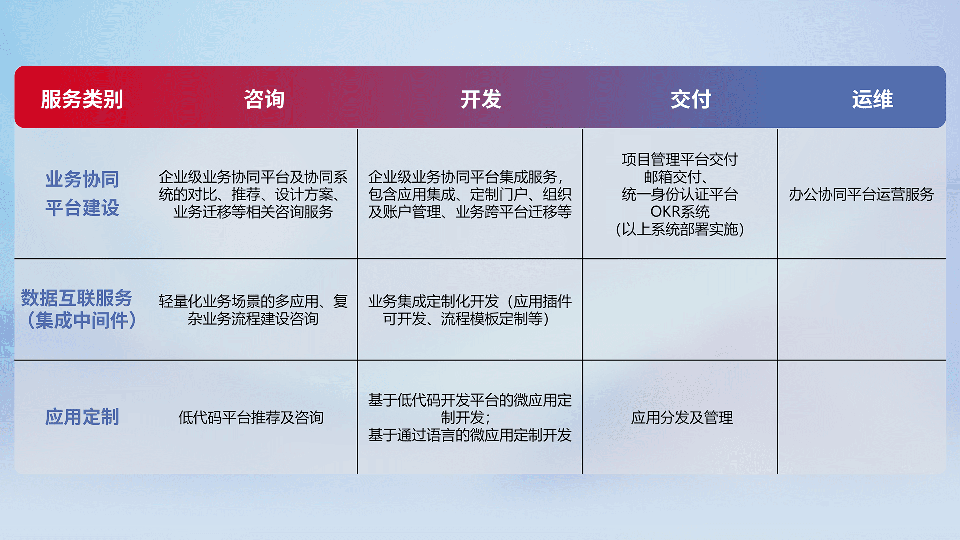 针对钉钉、、、企微、、、、IDaas等平台级产品提供产品的规划、、、、方案、、、交付、、、、定制化开发等服务,,,实现如统一协同办公、、、智能客户服务、、、、混合会议管理、、、智能数据查询、、、等业务场景,,实现数字化转型。。。