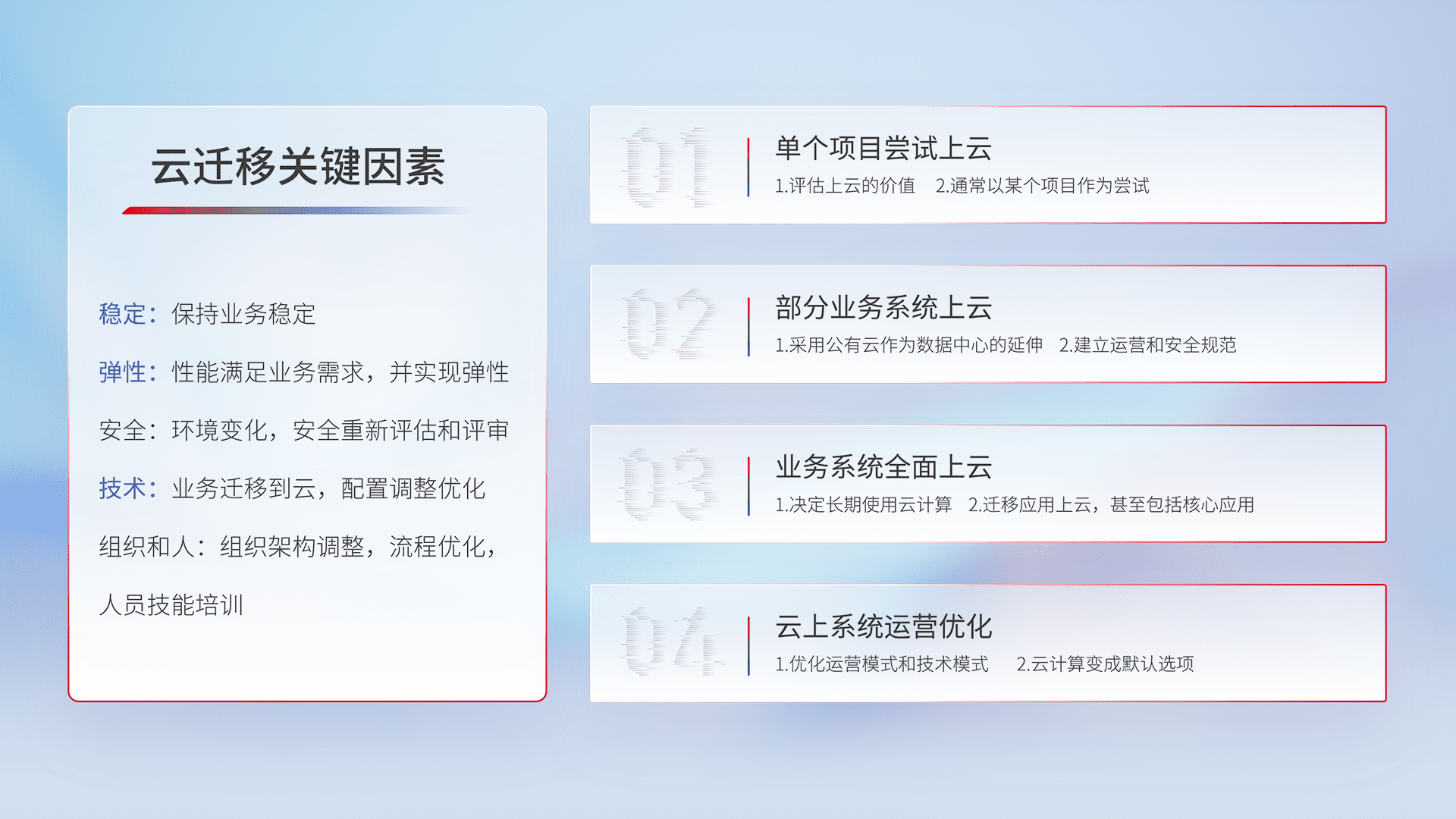 结合实际业务,,从规划设计、、云平台选型、、云原生改造、、、数据迁移、、、集成交付,,迁移全过程为客户识别最佳上云路径,,,,做好风险识别管理,,设计网络架构、、身份权限、、安全审计合规、、操作审计、、、日志审计、、、、监控告警策略、、、、多站点容灾设计等,,,,对云上基础设施进行整体规划,,,提升IT治理水平,,,,以满足弹性、、高可用、、、、高性能的需求。。。
