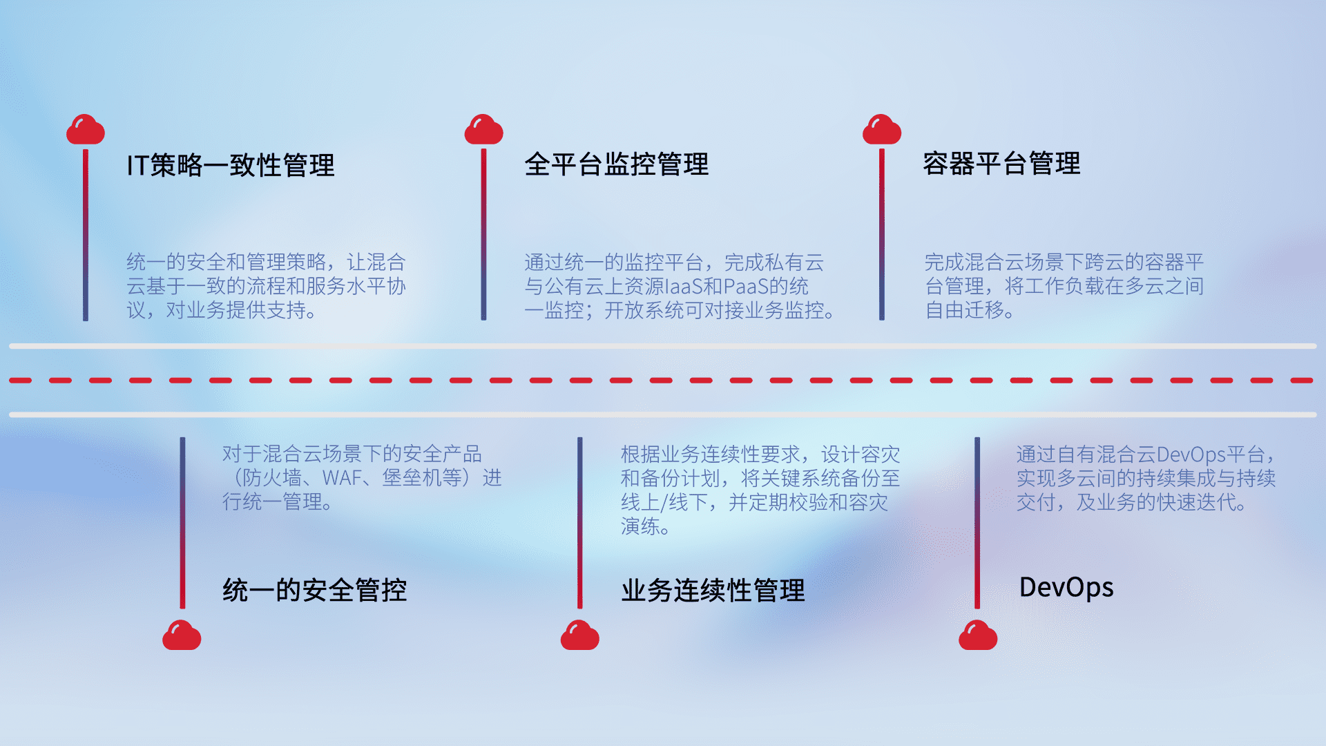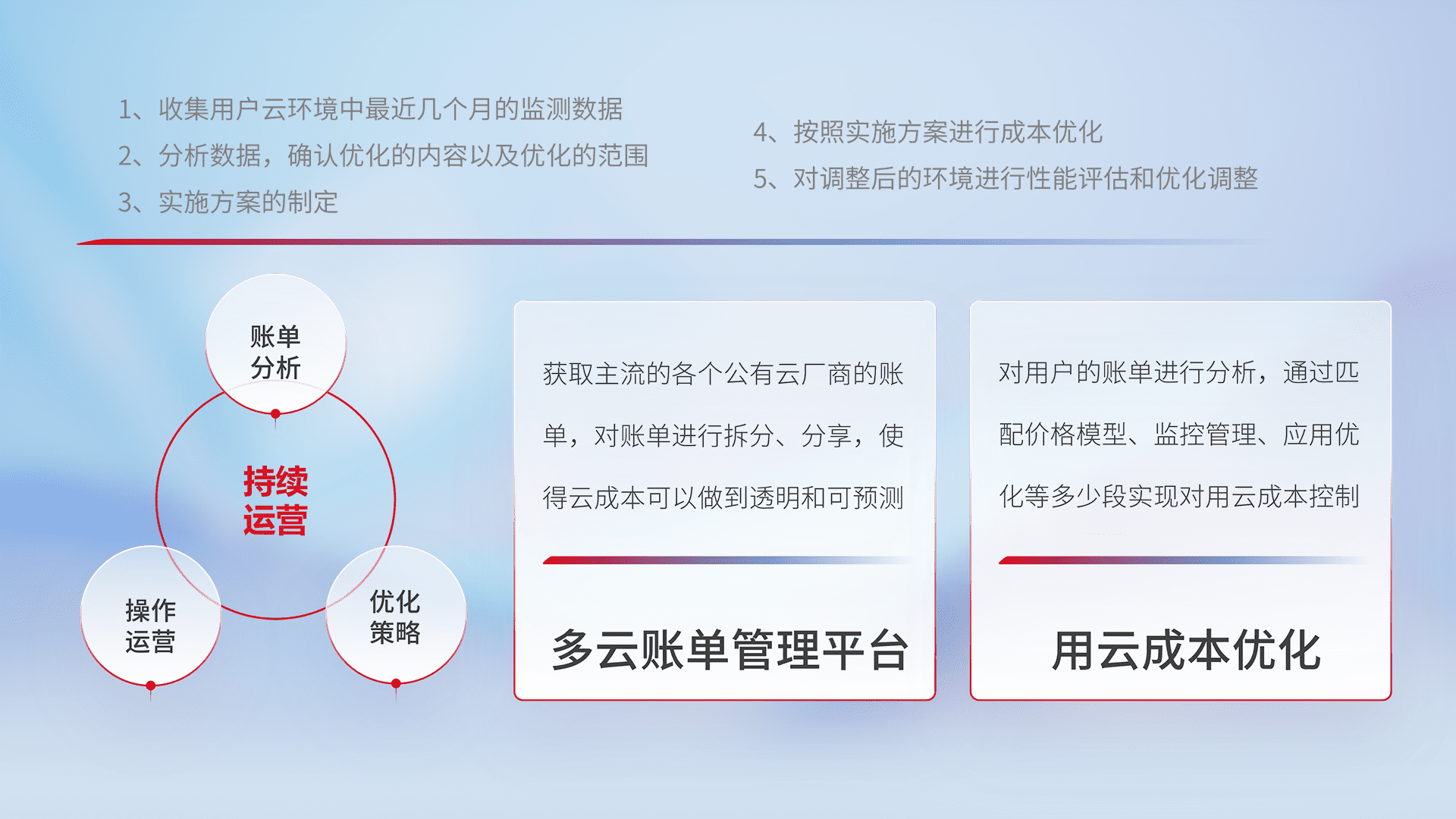 通过多云纳管,,,,以统一的资源数据模型把客户的云资源进行抽象和封装,,,,进而实现对多云资源的统一操作,,,保障云资源管理的可靠性、、、稳定性与可用性。。。。量身定制化运维内容,,,,配置、、、、开发运维、、补丁管理、、、备份、、、监控、、、、认证和访问管理、、、审计和日常巡检等,,保障在用云过程中的可靠度,,稳定度以及高可用率。。。。